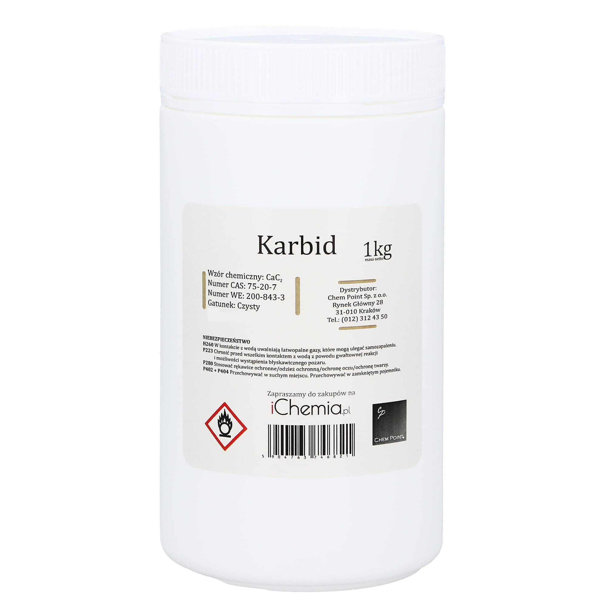 Opakowanie - Doypack PET (inne niż na zdjęciu) zawiera 1000g Karbidu w postaci kamyczków.